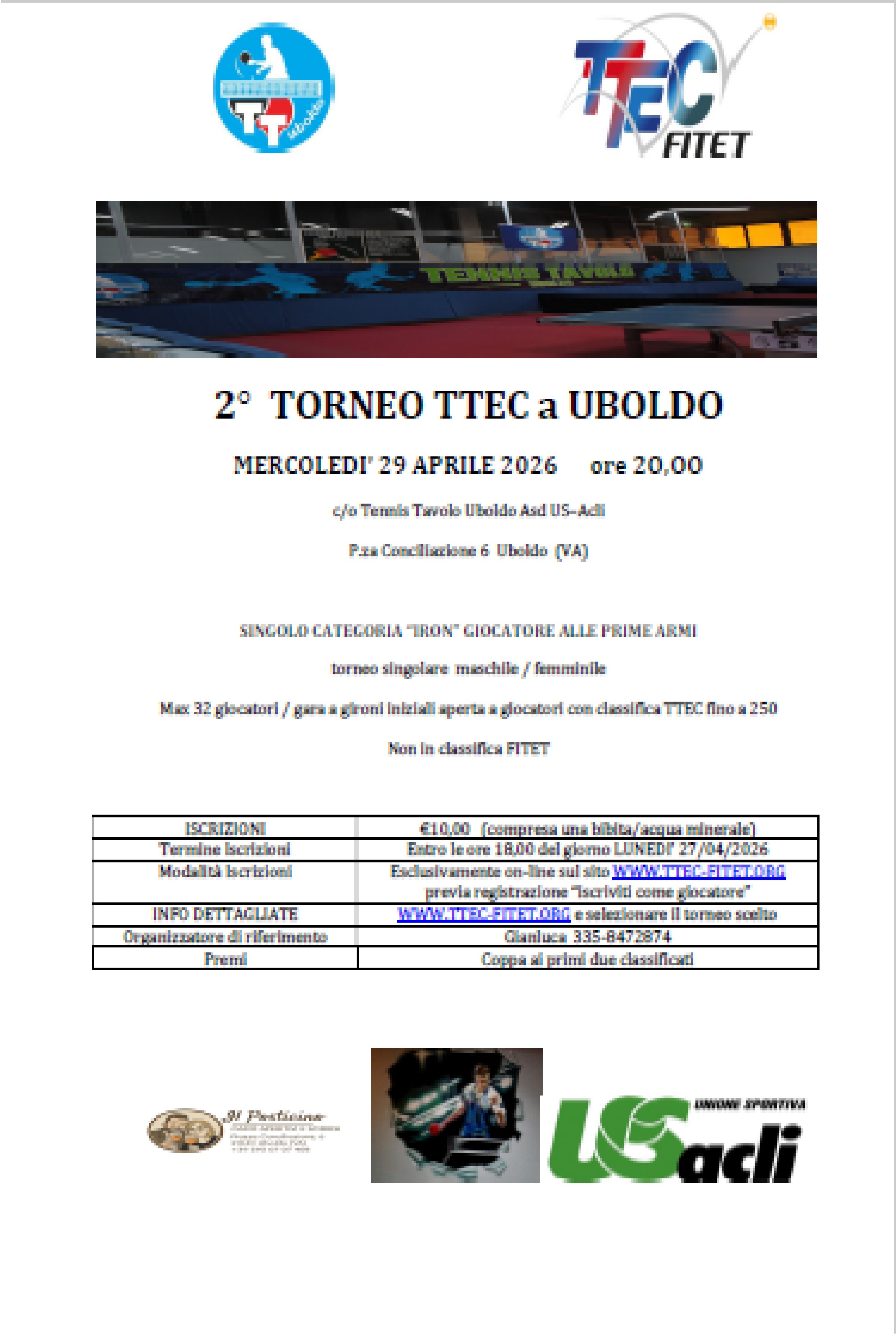 Si giocherà presso la sede del Tennis Tavolo Uboldo ASD US -ACLI in piazza Conciliazione 6, 21040 Uboldo (VA)